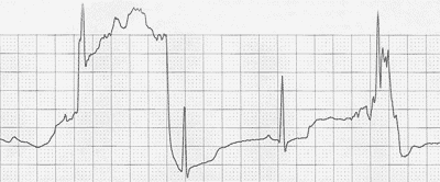 The biggest thing ruling out artifact is the isoelectric line – the flat line on your EKG- being relatively consistent across the entire strip. If we saw any significant deviation in level I might be more concerned about it being artifact. Pretty sure the EKG below means your driver just hit a speed bump at 30 MPH in the box.