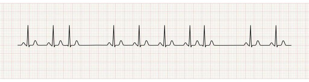 After that extra beat we see a compensatory pause. This can throw you off if you’re too quick to judge. It looks like a dropped beat from a type 2 heart block. What’s actually happening is the heart realizes it didn’t need that extra contraction and takes a momentary nap to set itself right again. We don’t see these too often in the field, probably because we aren’t doing enough to look for them.